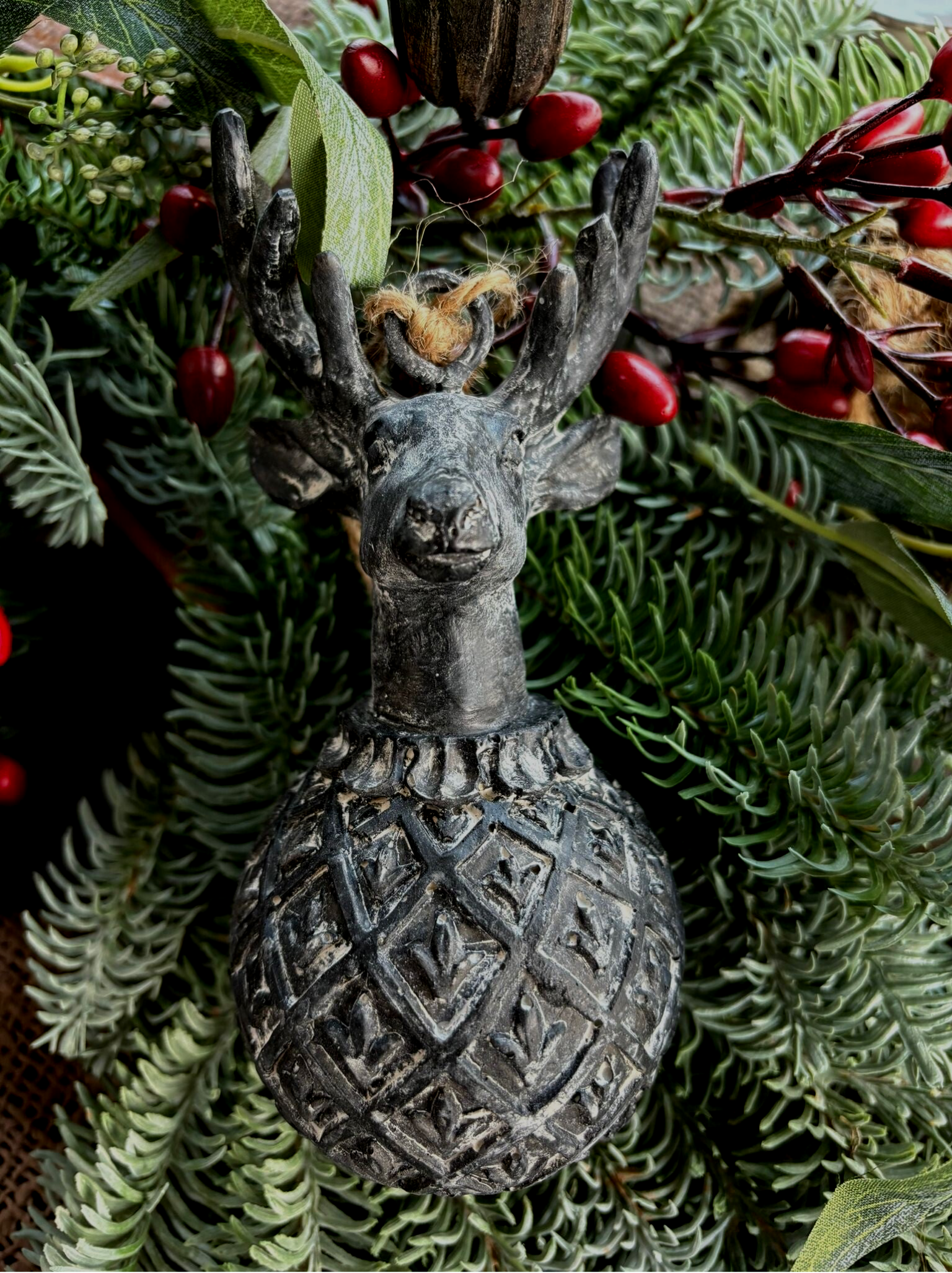 Deze prachtige kersthanger in de vorm van een hertenkop is een echte aanwinst voor je landelijke interieur! Hang hem in de kerstboom voor een warme, authentieke uitstraling, of geef hem een plekje in een mooie krans bij de voordeur. De rustieke look van de hertenkop brengt een vleugje bos en winterse charme in huis, perfect passend bij een landelijk decor. Of je hem nu ophangt in de boom, een krans, of een toef – deze hanger zorgt voor een gezellige en stijlvolle kerstsetting!
