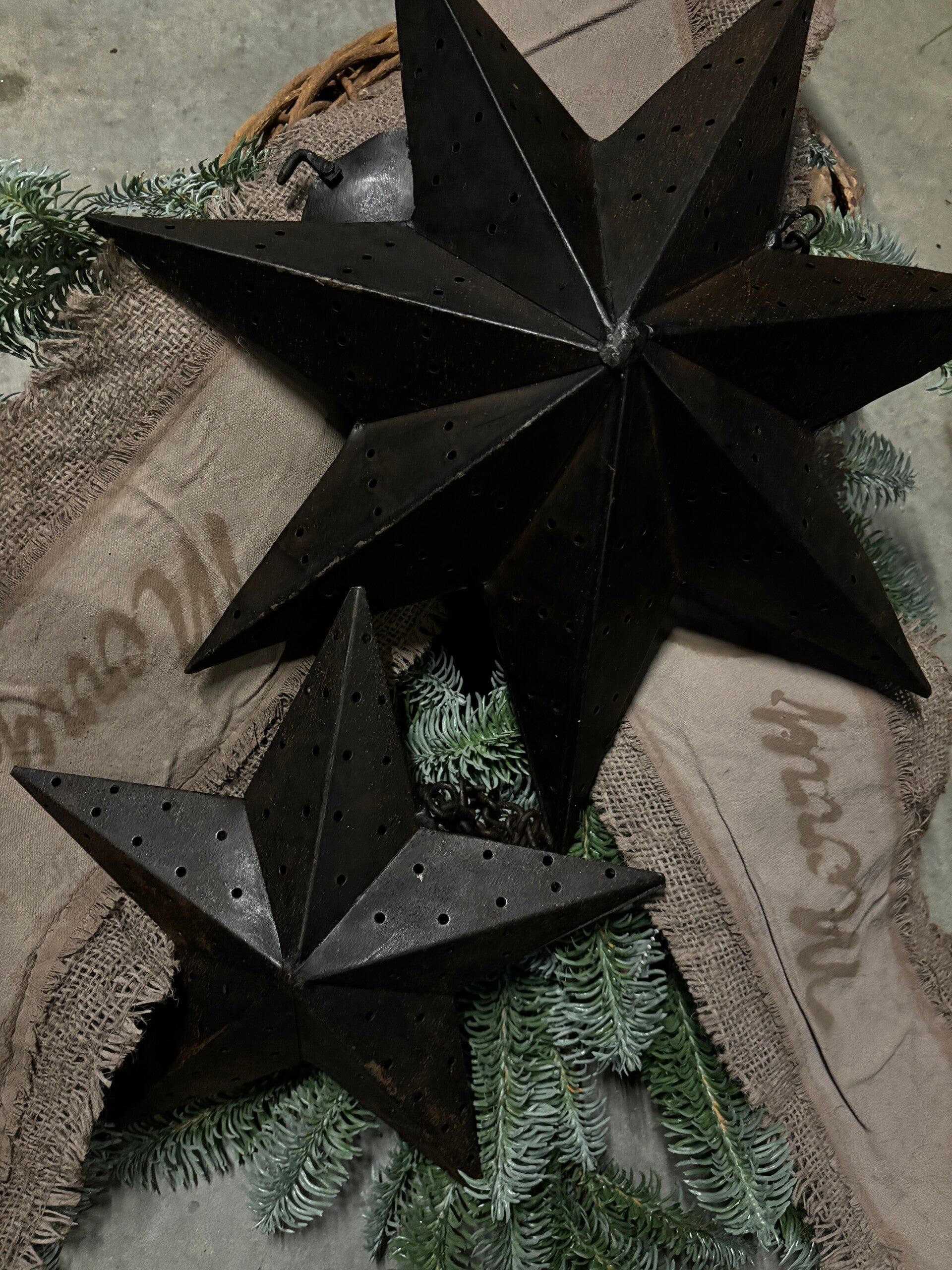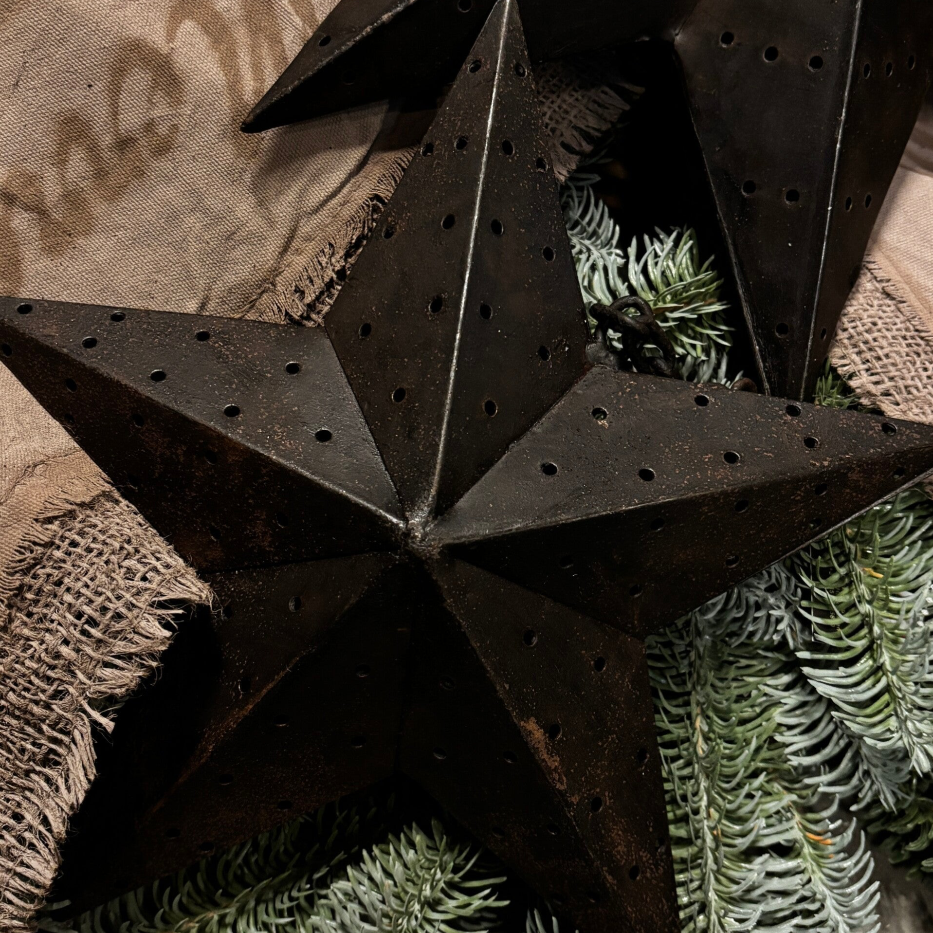 Deze metalen kerststerren hebben een formaat van 30cm en kunnen worden opgehangen met behulp van een stalen ketting. Ze zijn momenteel in een nette, onbehandelde kleur, maar zullen na verloop van tijd een roestige kleur krijgen door natuurlijke oxidatie.