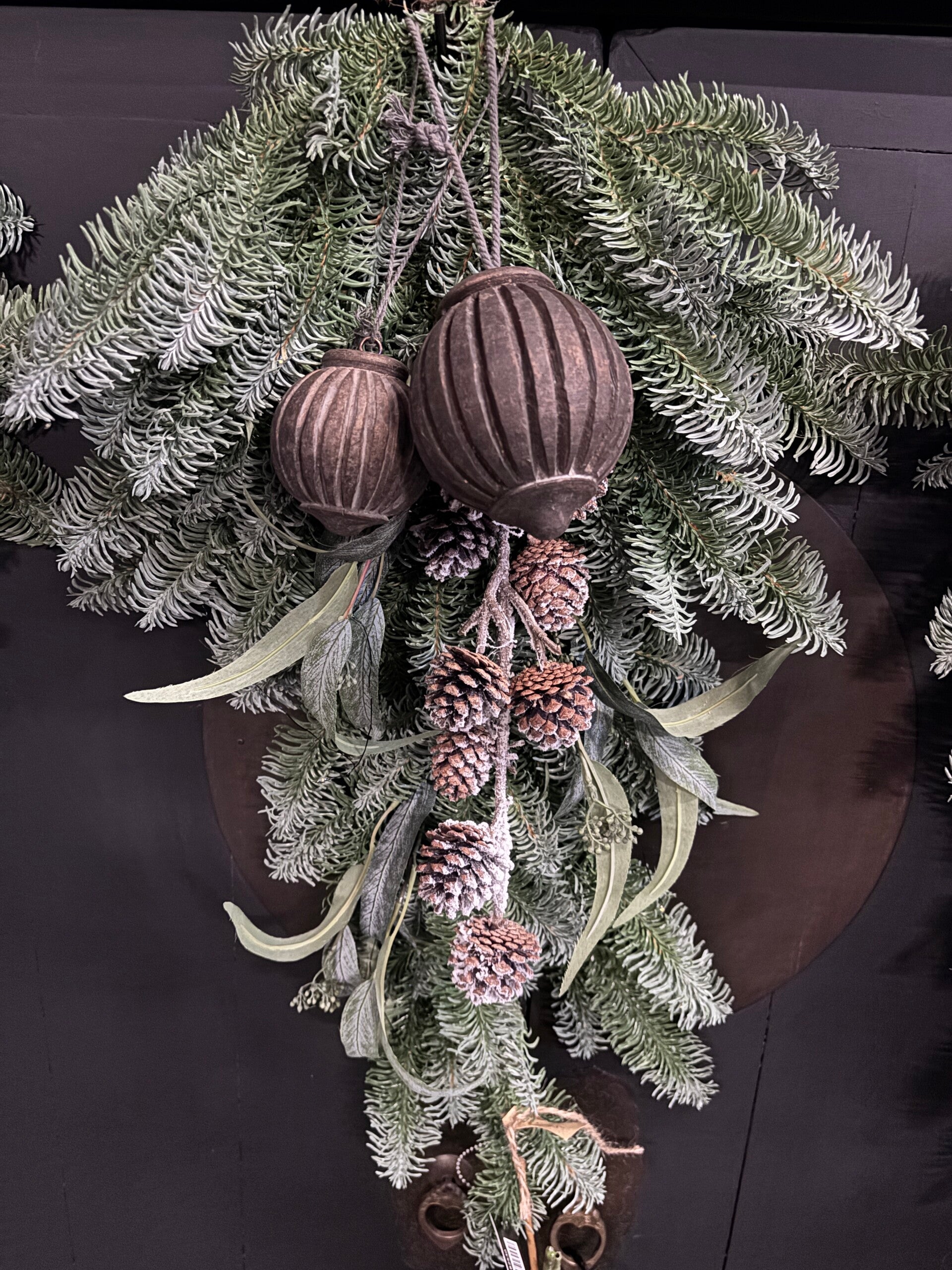 Deze toef geheel kunst is 110cm met steel. Deze toef is voorzien van twee houten ballen, dennenappels en led lampjes.