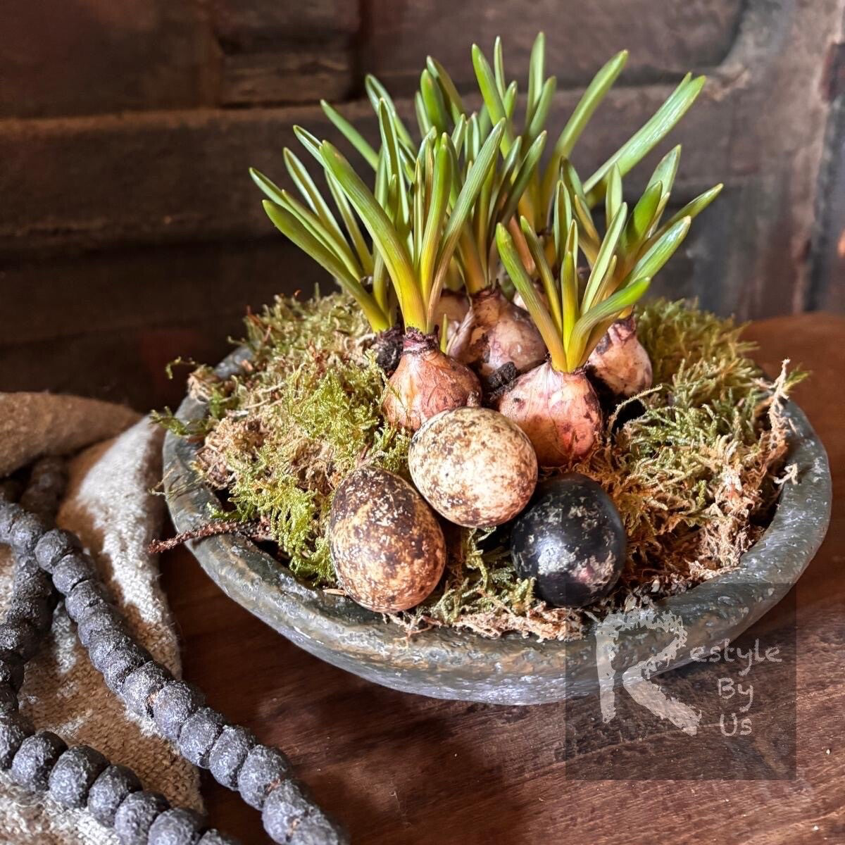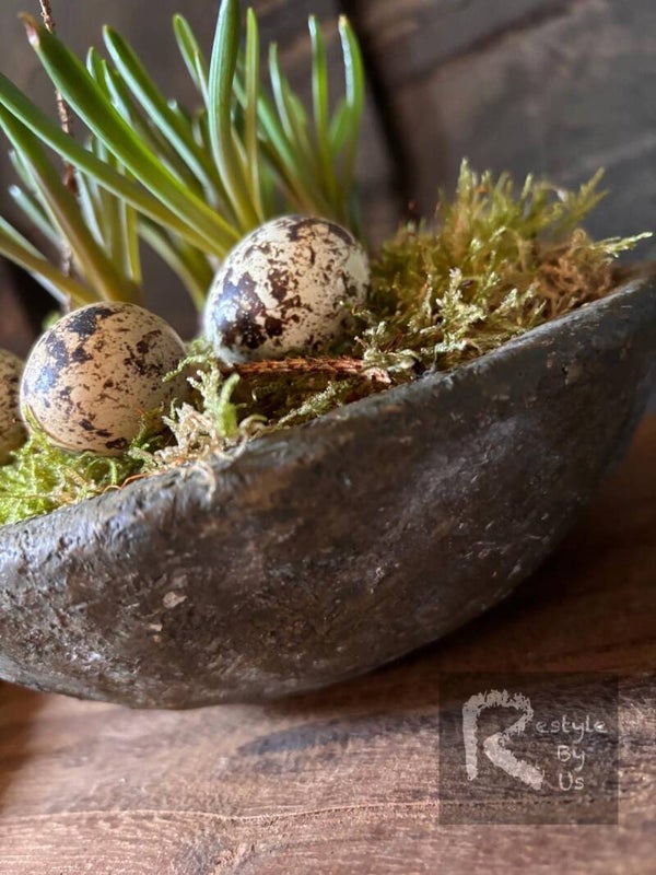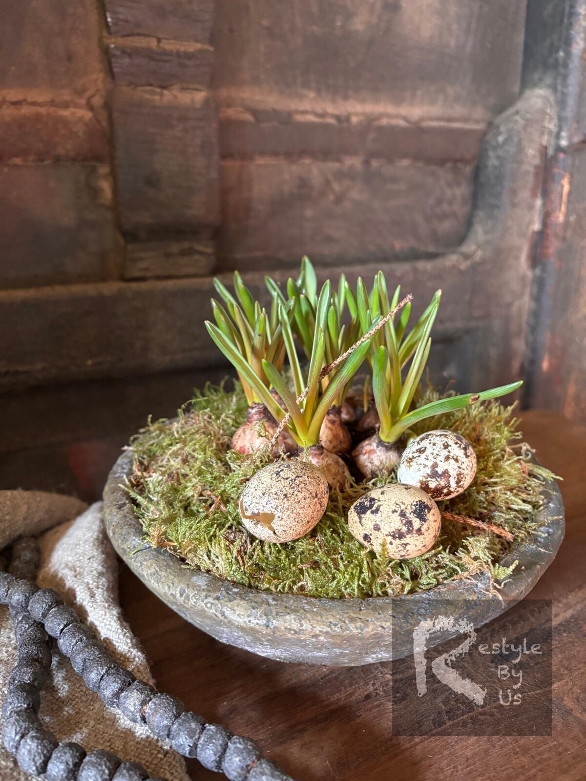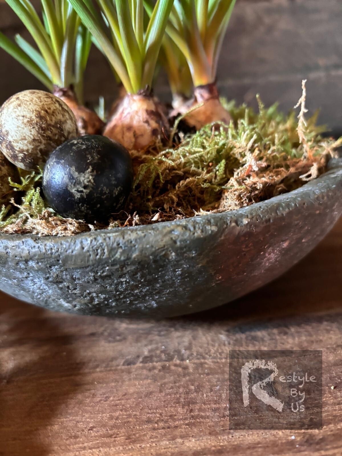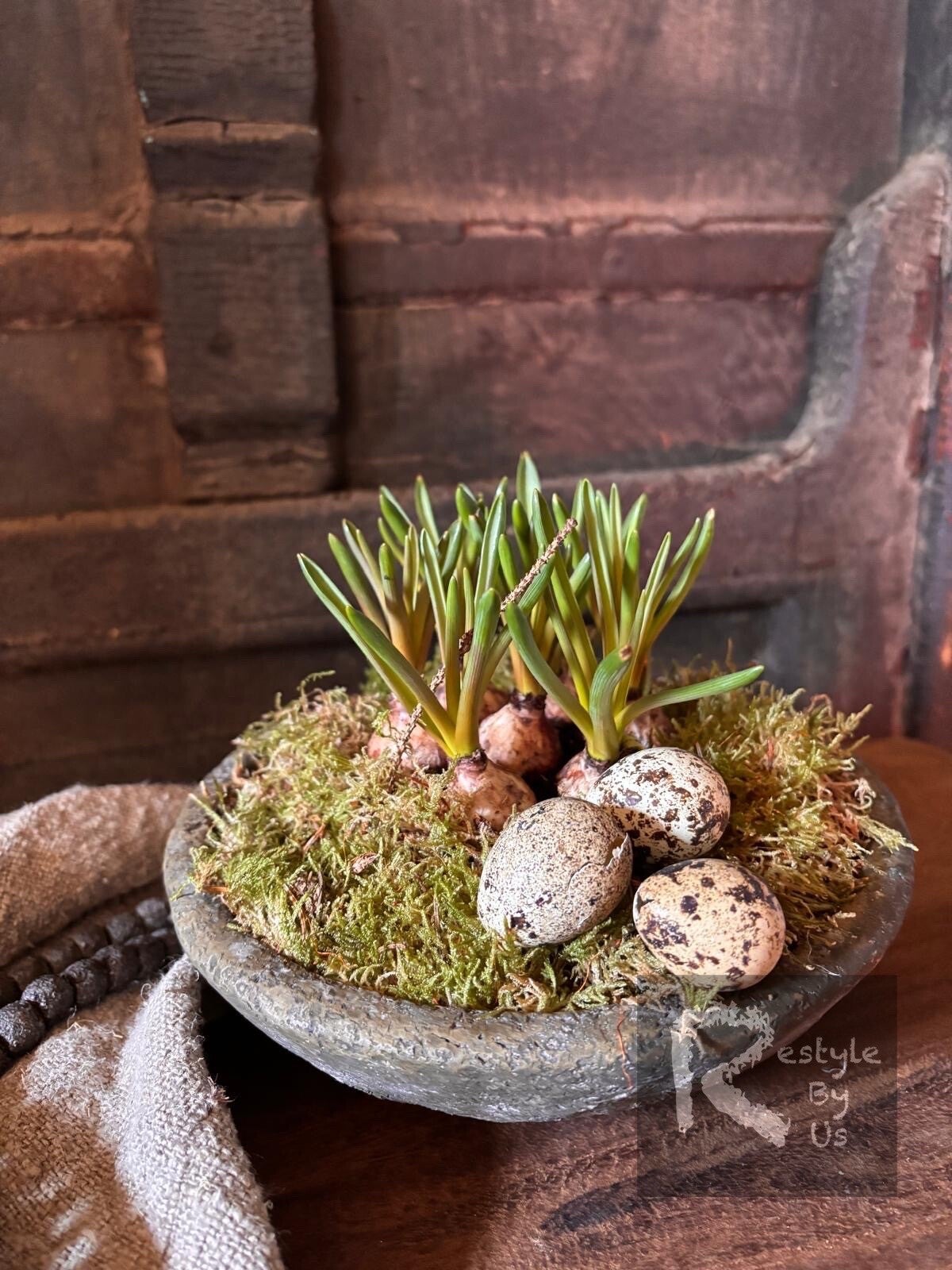 Echte blauwe druifjes in een stoere schaal met leuke kwarteleitjes en mos. compleet.