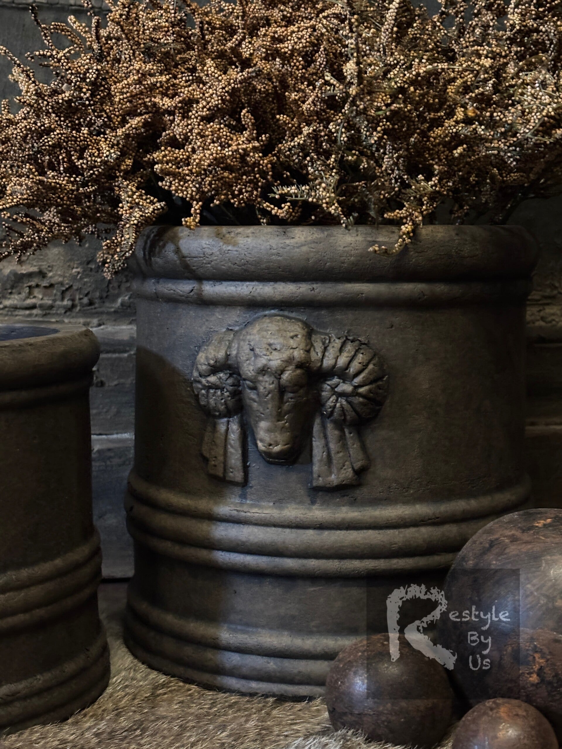 Deze stoere ram potten van BRYNXZ in de kleur Majestic Brown geven elk interieur of terras een krachtig accent. De potten zijn afgewerkt met een gedetailleerd reliëf van een ramshoofd en hebben een robuuste, handgemaakte uitstraling. Perfect te combineren met droogbloemen, planten of als losstaand decoratiestuk.
