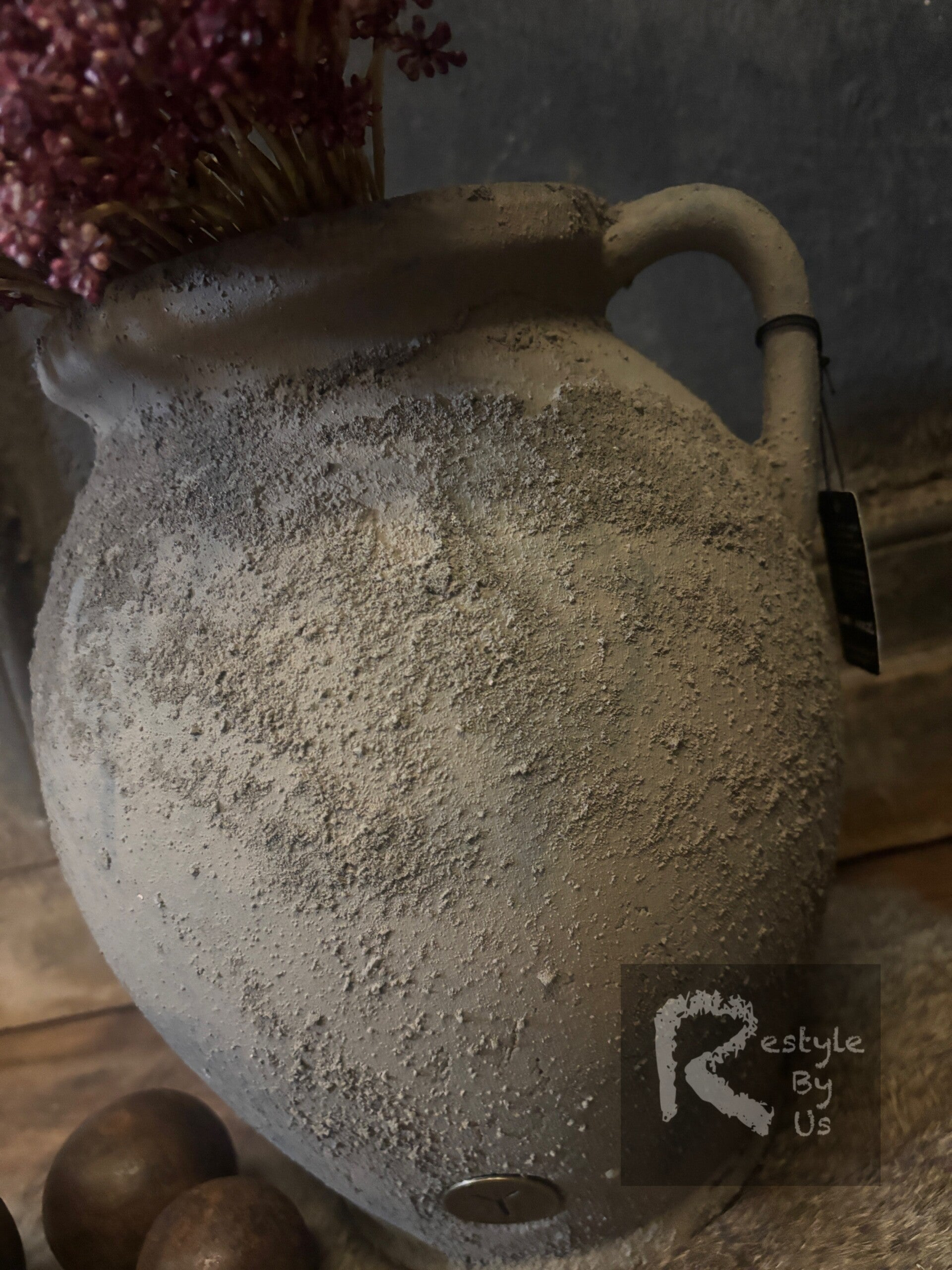 Deze prachtige rustieke kan met oor van BRYNXZ is een stijlvol en karaktervol decoratiestuk. Uitgevoerd in een zandkleurige stone-look met een grove, verweerde textuur, straalt deze pot pure ambacht en warmte uit. De subtiele imperfecties in het oppervlak geven een authentiek gevoel van tijd en traditie.