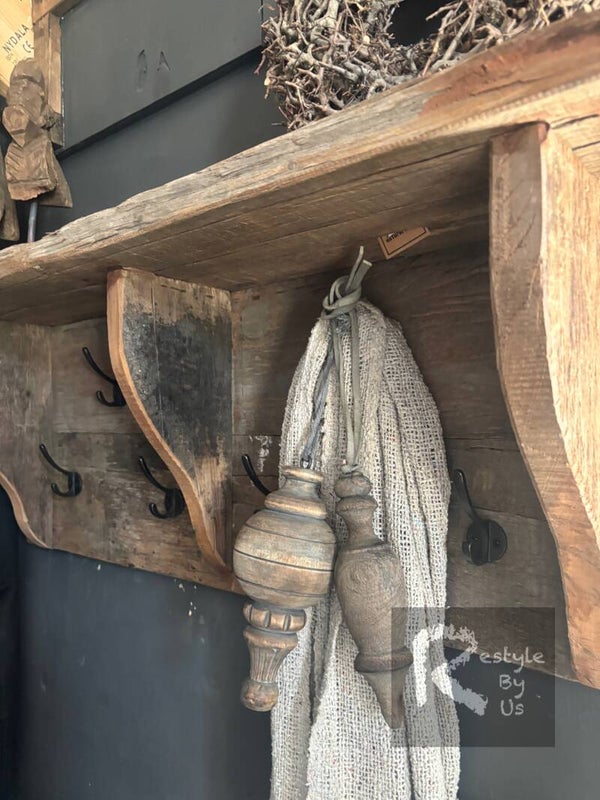 Dit stoere landelijke wandrek is gemaakt van authentiek oud hout en voorzien van een robuuste bovenplank en stevige metalen haken. Door de natuurlijke veroudering van het hout straalt dit regaal warmte, karakter en ambacht uit – perfect voor een interieur in landelijke, sobere of brocante stijl.