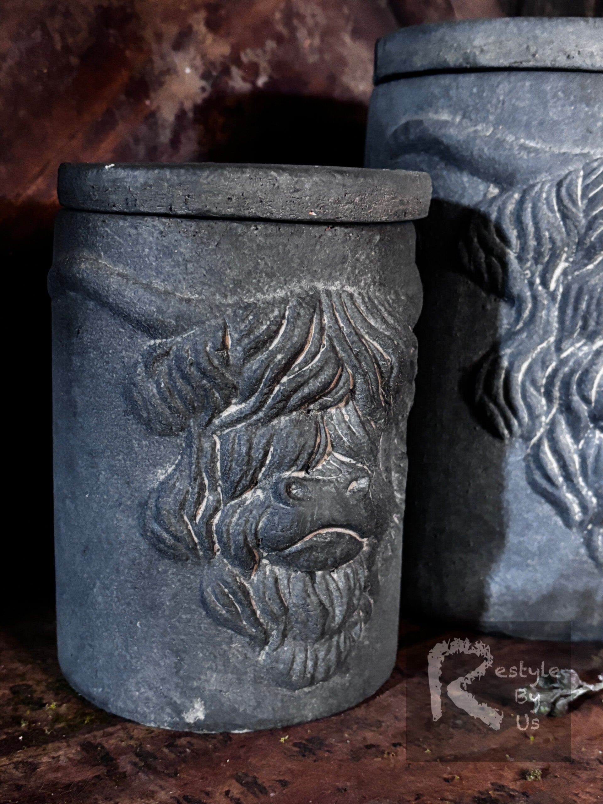 Prachtige potten met deksel met schotse hooglander erop.