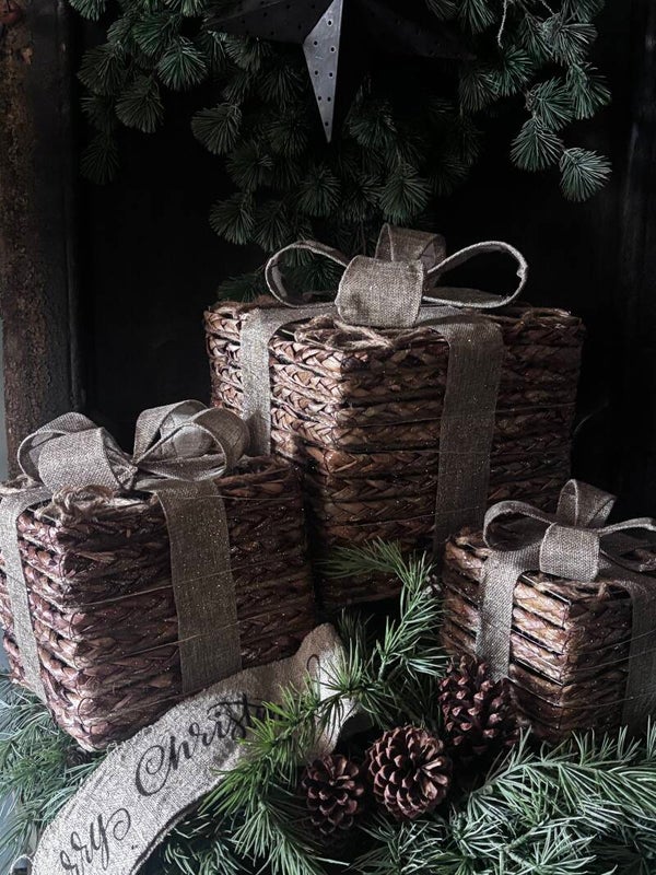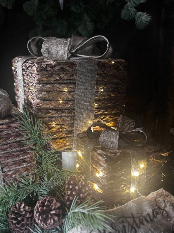 Led cadeautjes set van touw met een jute strik met glitters en LED-verlichting. Dit sfeervolle kerstcadeau zorgt voor een warme en decoratieve uitstraling onder de kerstboom, op een sidetable of in de vensterbank.