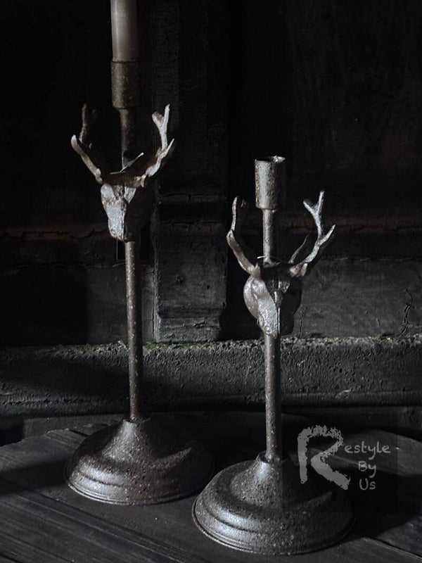 Deze stoere metalen kandelaar met hertenkop en gewei is een echte blikvanger in je interieur. De rustieke afwerking en robuuste uitstraling maken deze kandelaar perfect voor een landelijke of industriële woonstijl.
