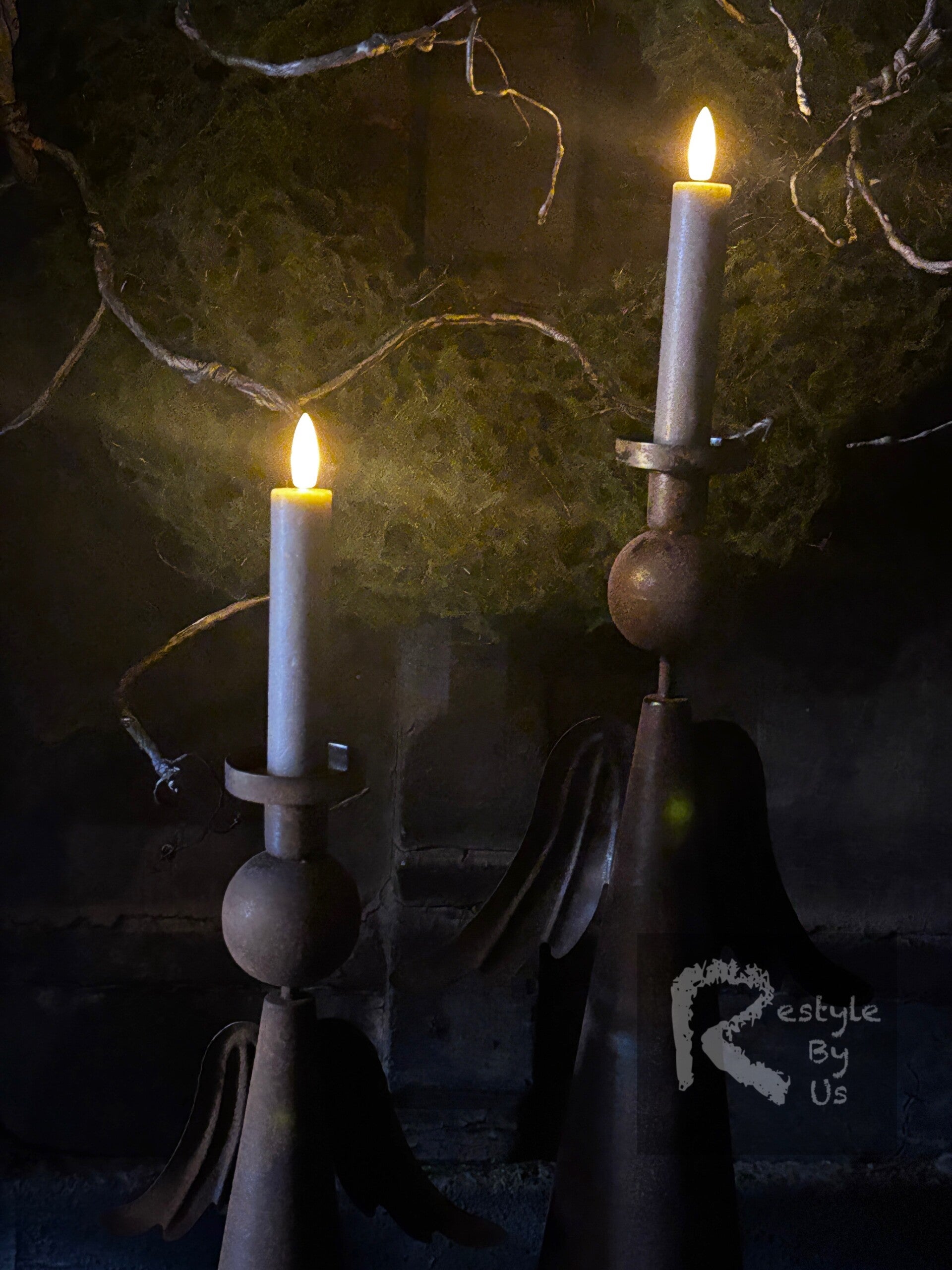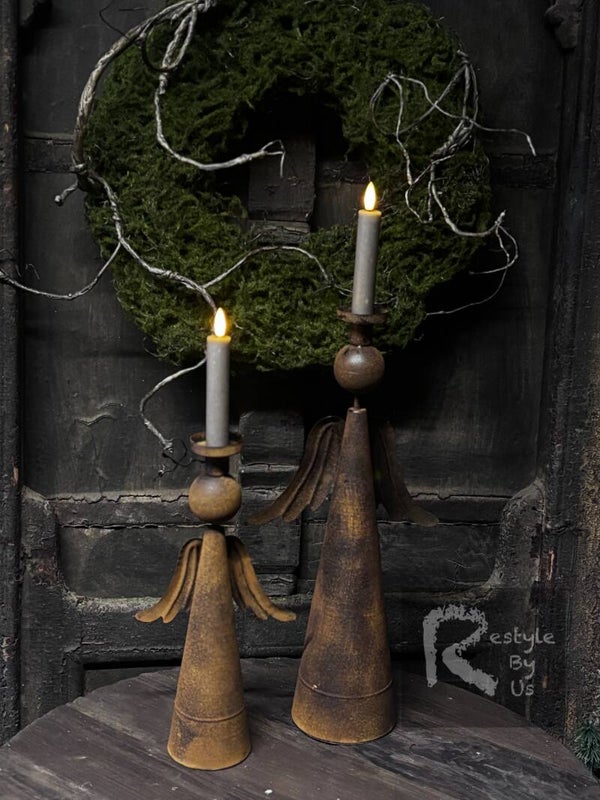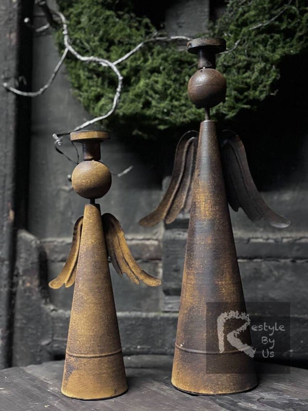 Stoere metalen engel Emely in roestlook. Te gebruiken als kandelaar of stijlvolle kerstdecoratie. Verkrijgbaar in twee maten.