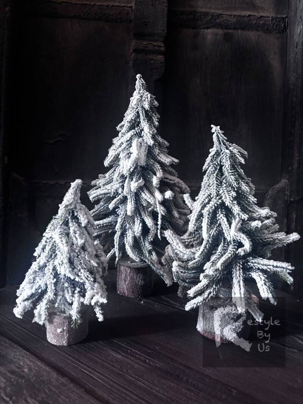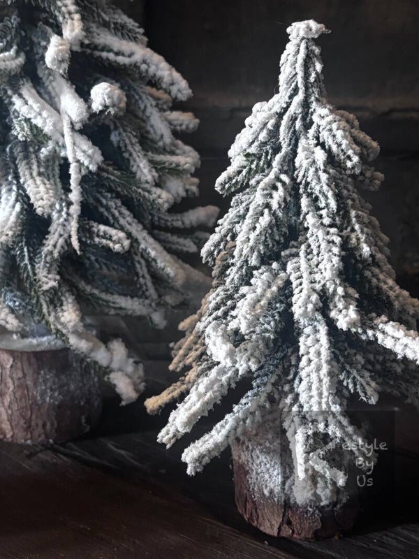 Breng direct een winterse, landelijke sfeer in huis met deze prachtige rustieke kerstboompjes. Elk boompje is rijkelijk bedekt met een sneeuwlaagje en staat stevig op een houten stamvoet voor een natuurlijke en authentieke uitstraling. Perfect als decoratie voor op tafel, in een vensterbank of als onderdeel van een kerstdorpje.