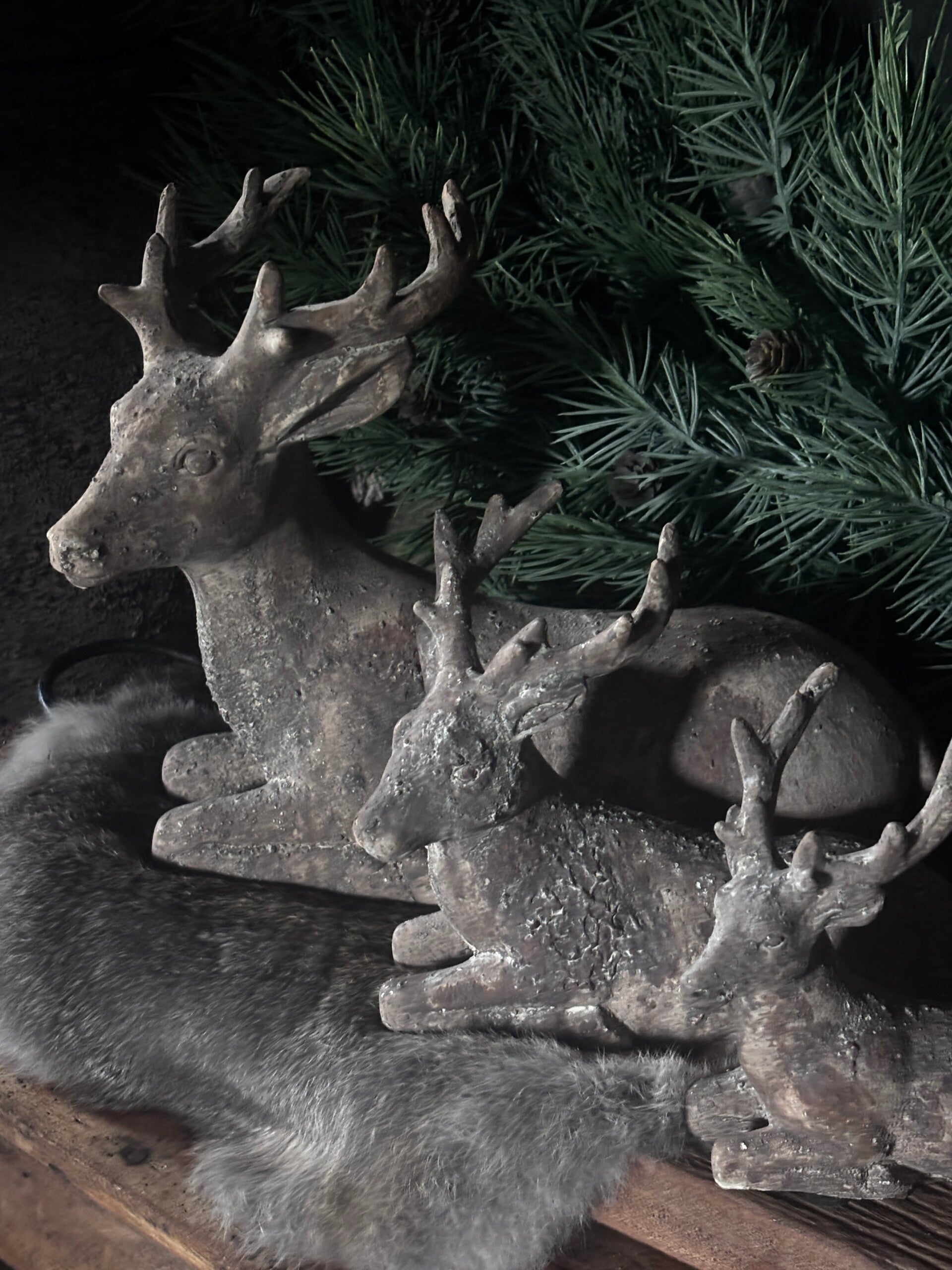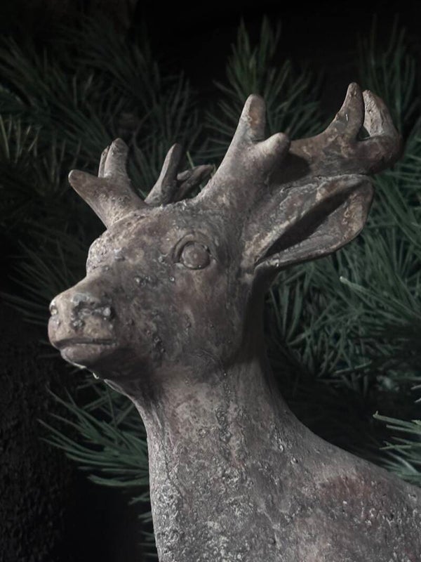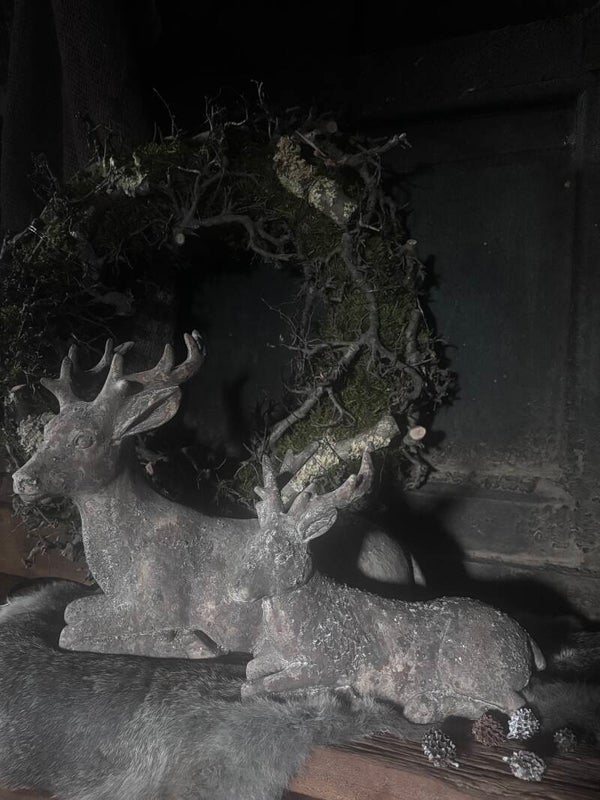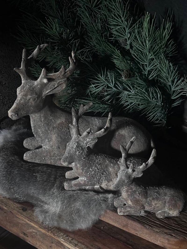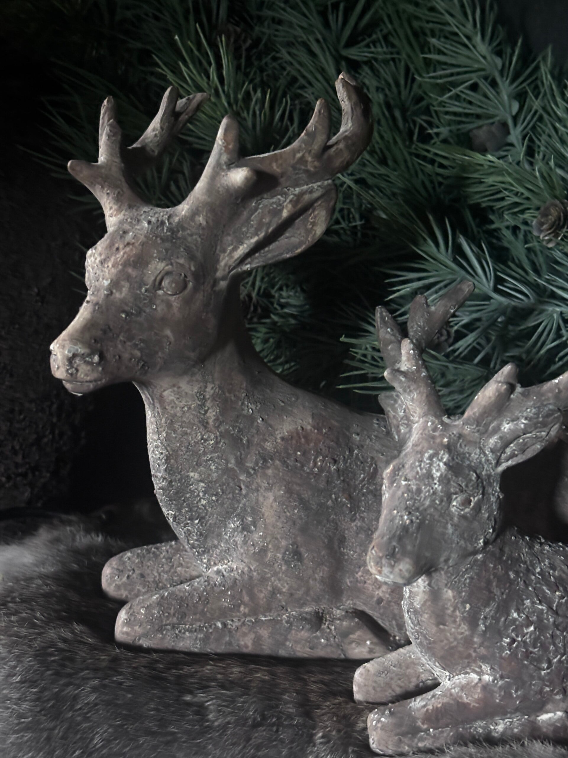 Deze prachtige liggende herten in een warme zandkleur stralen rust, elegantie en natuurlijke charme uit. Met hun verweerde afwerking en zachte aardetint passen ze perfect in een landelijk, brocante of natuurlijk interieur.
