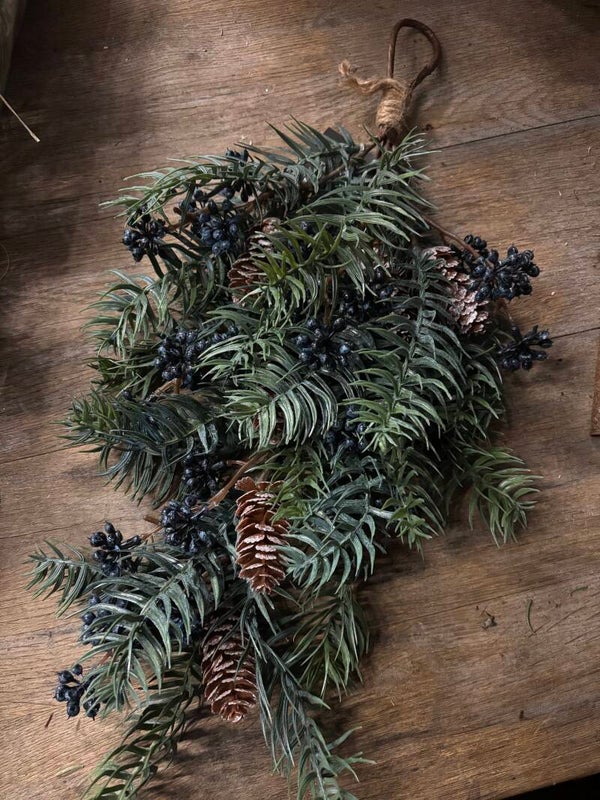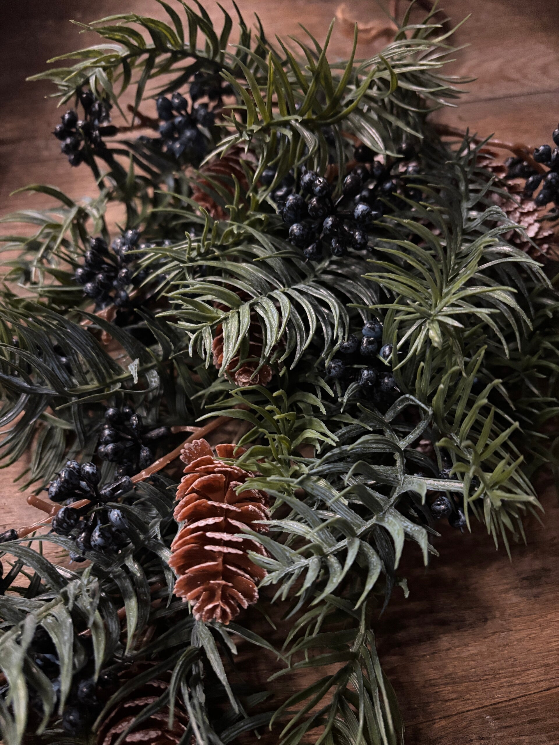 Rijk gevuld met naaldgroen, blauwe bessen en dennenappels