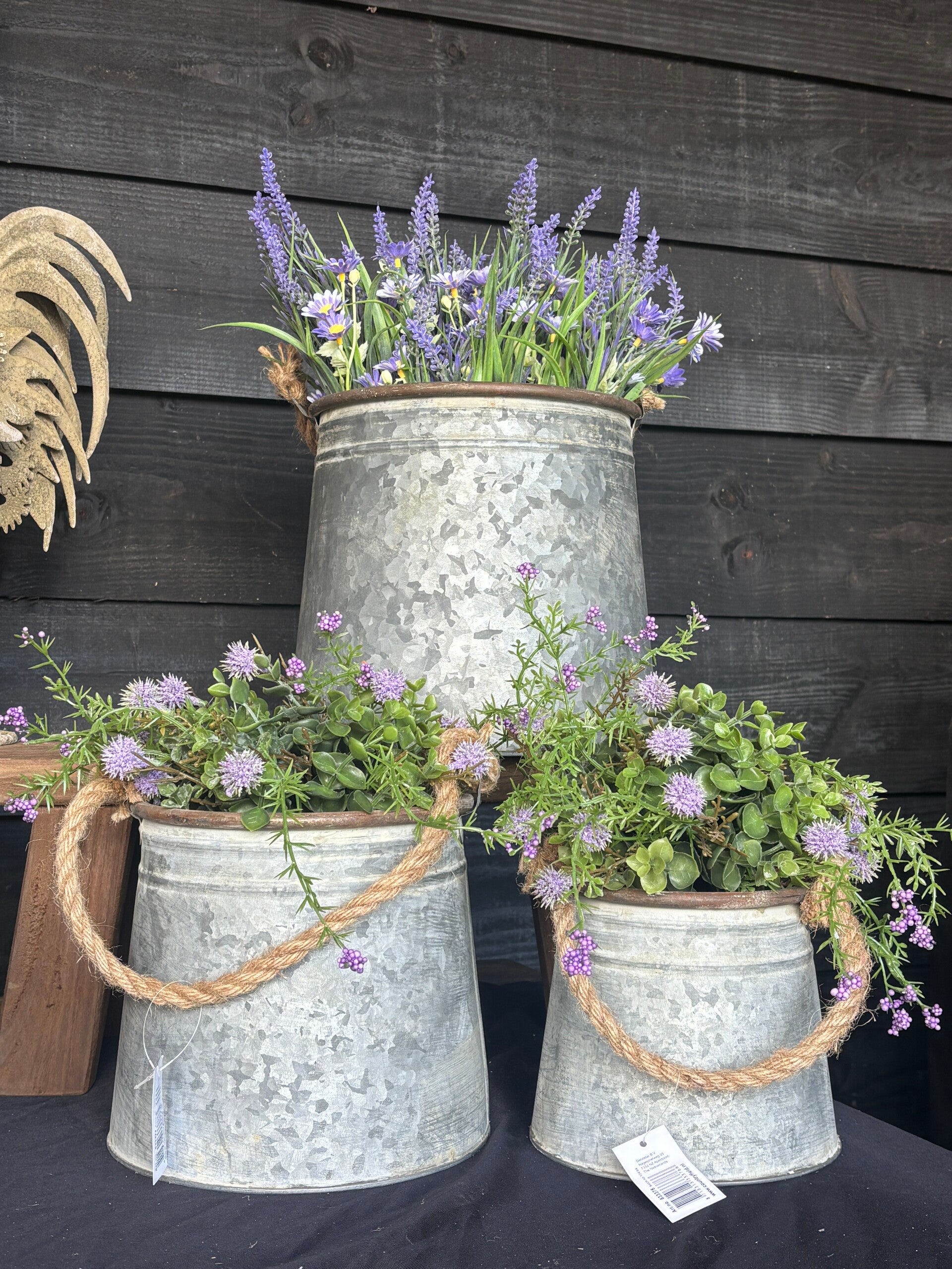 Stoere zinken potjes met decoratief touw, perfect voor een landelijke of industriële uitstraling. Ideaal als plantenpot of decoratie, geschikt voor binnen en buiten.